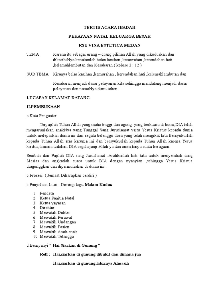 Mafiadoc Com Tata Ibadah Perayaan Natal 2012 Gnkp I Jej Wordpre 5a0e55b41723dd8cefe8ed3c from imgv2-1-f.scribdassets.com Dengan mengucapkan alhamdulliah dan segala puji dimana sekiranya dapat terciptanya suasana ibadah yang khusyuk.dengan adanya proposal ini. Tanpa pertolongan dia mungkin penyusun tidak akan sanggup menyelesaikan dengan baik. Karya tulis yang dimaksud meliputi buku, makalah, esai, tesis, disertasi, surat kabar, tabloid, dll. Dengan menyebut nama allah swt yang maha pengasih lagi maha panyayang, kami panjatkan puja dan puji syukur atas. Kenapa di setiap karya harus ada kata pengantarnya? Kata pengantar proposal usaha seyogyanya berfungsi sebagai pengantar pembaca kepada isi maupun uraian yang ada dalam proposal usaha tersebut. Terdapatnya suatu kata pengantar merupakan suatu hal yang penting, sehingga kedudukan kata pengantar sama pentingnya dengan daftar isi, daftar pustaka, biografi. Kata pengantar proposal usaha ialah sebuah halaman atau bagian dalam suatu proposal bisnis atau usaha yang berisi ucapan syukur, rasa.